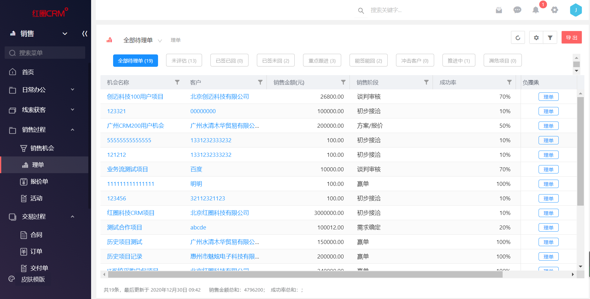 在銷售管理方面,2020 年紅圈 CRM 也有了長足的改進,新增了交付單和報價單管理,為實現 CPQ 奠定基礎。增加變更單,支持合同變更。新增找線索功能,幫助企業(yè)高效獲取銷售線索。還有優(yōu)化改進理單和公海池等等。在銷售管理方面的不斷打磨演進,使紅圈 CRM 更好的服務于裝備制造行業(yè)。