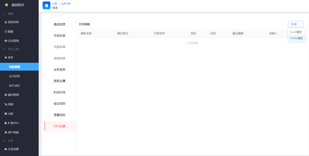 - 配置和普通excel模板打印設(shè)置在一起,路徑為:系統(tǒng)設(shè)置——業(yè)務(wù)——對象管理——打印設(shè)置。