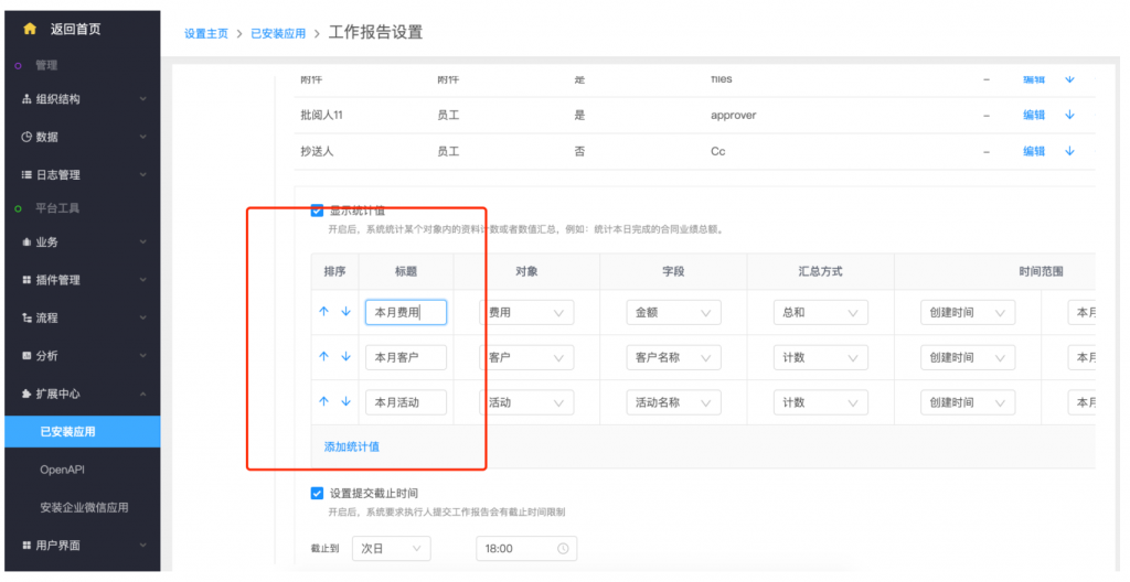 - 后臺設(shè)置:系統(tǒng)設(shè)置——擴展中心——已安裝應(yīng)用——工作報告,類型設(shè)置支持新建類型;在模板設(shè)置中,可以按業(yè)務(wù)類型設(shè)置不同的字段和統(tǒng)計值;統(tǒng)計值設(shè)置,支持自定義名稱;