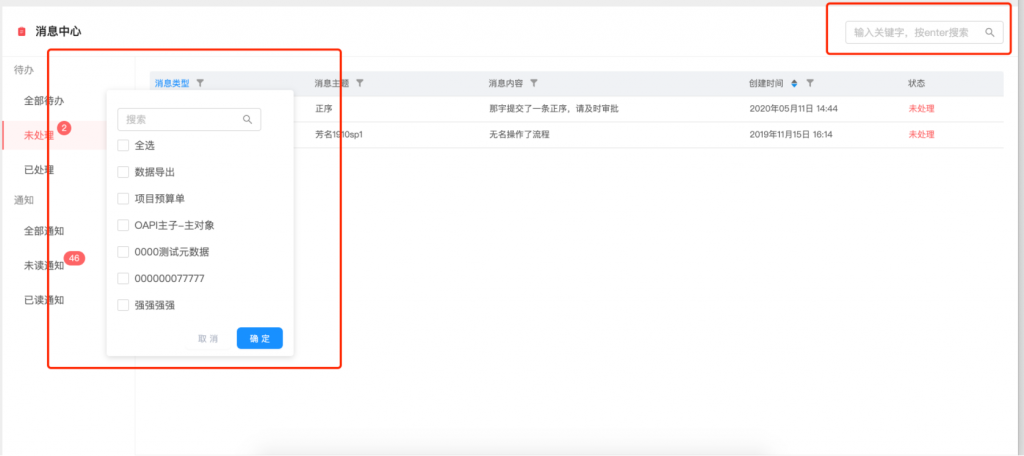 - 消息通知的類型和主題進行了規(guī)范,便于進行分類和篩選;每條消息可明確看到業(yè)務(wù)來源,主題更加清晰,大幅度減少了以“通知”為標(biāo)題的消息;同時查看或處理變?yōu)檎锌牲c擊;消息支持篩選和搜索,也可以直接搜索內(nèi)容或主題;待辦和通知的狀態(tài)變化更加智能,去除了手動按鈕操作,當(dāng)處理或查看詳情后,狀態(tài)會自動變化;同時優(yōu)化了紅點顯示數(shù)量的刷新機制,更新更及時.
