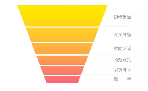 舉個例子,健康的銷售漏斗應該是上圖這樣的,各階段的轉化率比較均勻,如果漏斗在中間某一段突然收窄,可能是在業(yè)務推進的某個階段出現(xiàn)了瓶頸,這時企業(yè)需要結合產(chǎn)品的銷售周期等因素,尋找漏斗“阻塞”的原因,及時做出調(diào)整。