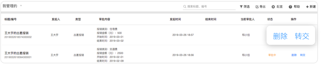 小王平時(shí)不僅會提交“出差報(bào)銷”這種辦公類審批,還會提交“合同審核”這種經(jīng)營類審批。公司希望每類審批都由專人來管理模板與數(shù)據(jù),防止敏感數(shù)據(jù)內(nèi)部泄露。這時(shí)公司可以為每個(gè)審批設(shè)置“模板管理員”,由該審批生成的全部數(shù)據(jù)將只能由這個(gè)模板管理員維護(hù)并導(dǎo)出。同時(shí)他也可以將審批中的流程轉(zhuǎn)交給其他人,以避免出現(xiàn)審批人休假或離職后流程卡住的情況。模板管理員還可以協(xié)助企業(yè)管理員來編輯審批模板,有效分擔(dān)工作。