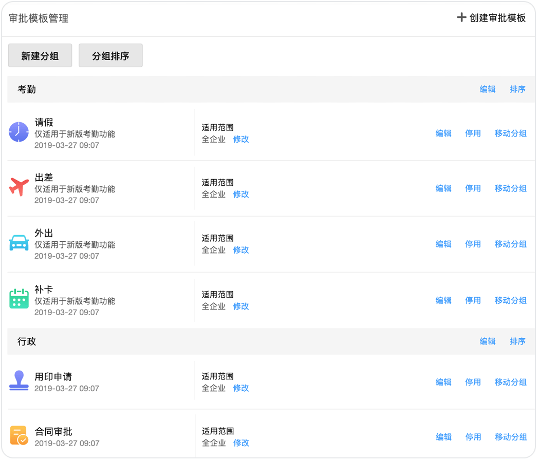 企業(yè)可以通過自定義審批類別和模板來規(guī)范審批的格式,并為所有審批進(jìn)行分組、排序,讓審批管理和使用都更加便捷。