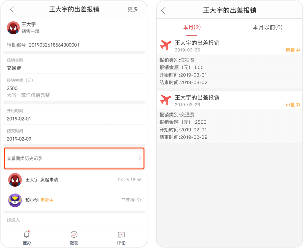 審批人可以查看發(fā)起人同類審批的歷史情況。比如報(bào)銷審批時(shí),可以看該員工本月或之前已經(jīng)發(fā)起了幾次報(bào)銷申請。