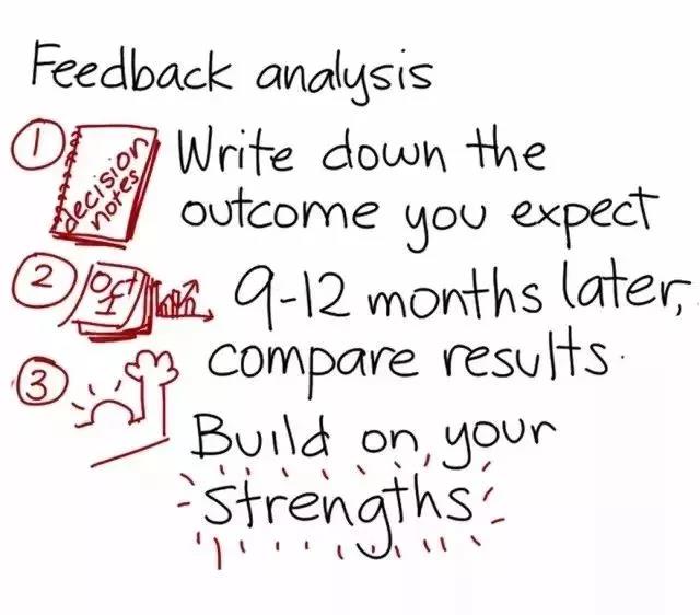要發現自己的長處,唯一途徑就是回饋分析法(feedback analysis)。每當做出重要決定或采取重要行動時,你都可以事先記錄下自己對結果的預期。9 到 12 個月后,再將實際結果與自己的預期比較。