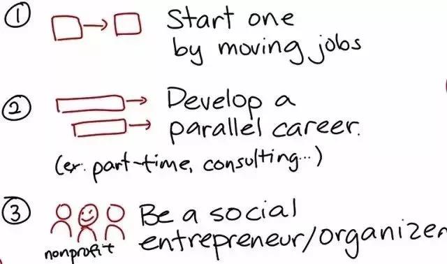 許多人的第一職業十分成功,他們還會繼續從事原有工作。除此之外,他們會開創一項平行的工作,通常是在非營利機構。