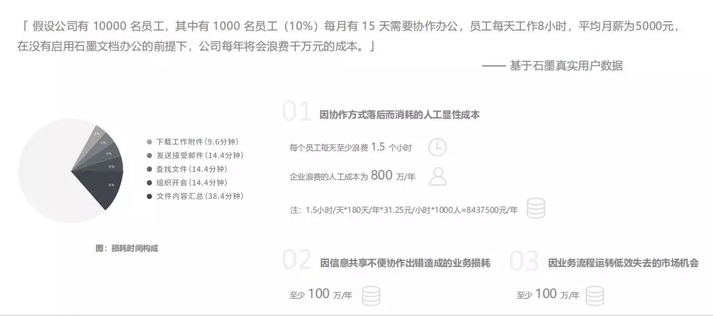集腋成裘,員工每天花費(fèi)在傳輸文件、查找文件、內(nèi)容匯總、文件傳輸上的時(shí)間并不是個(gè)小數(shù)目。對(duì)于一家10000 人規(guī)模的企業(yè)來(lái)說(shuō),每天至少要耗費(fèi) 90 分鐘的無(wú)效時(shí)間,這直接導(dǎo)致企業(yè)每年需要付出將近 800 萬(wàn)元的無(wú)效成本。