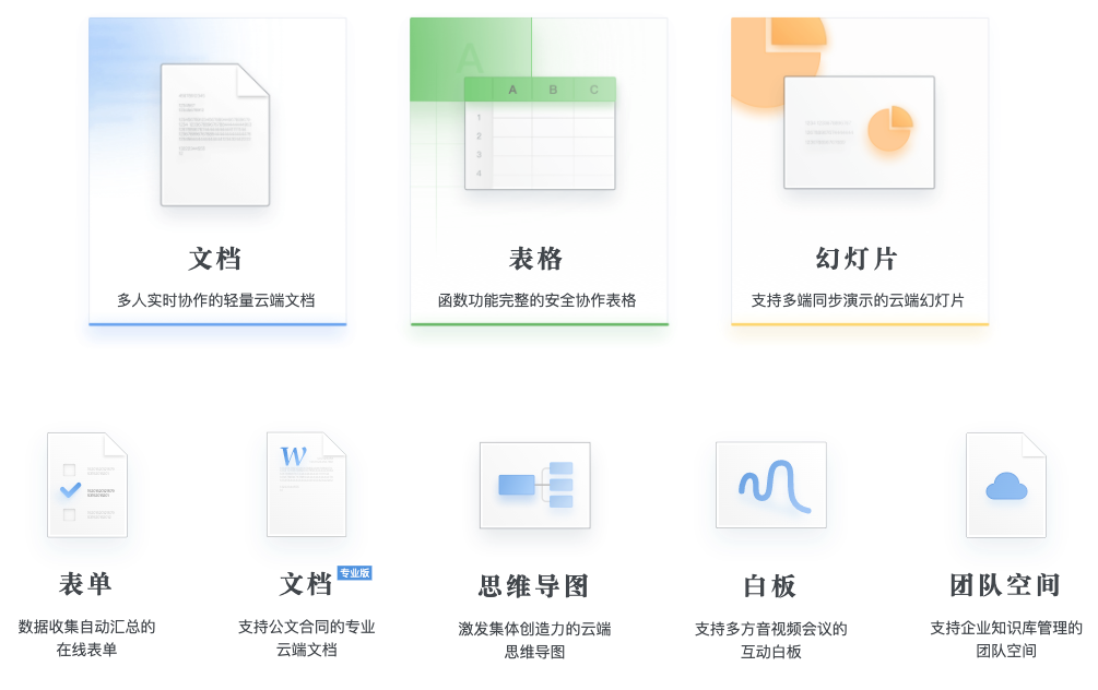 石墨文檔發(fā)展至今,已有產(chǎn)品線包含文檔、表格、表單、幻燈片、思維導(dǎo)圖、白板、團(tuán)隊(duì)空間等,基本可以滿足企業(yè)辦公場(chǎng)景中的常見(jiàn)需求。