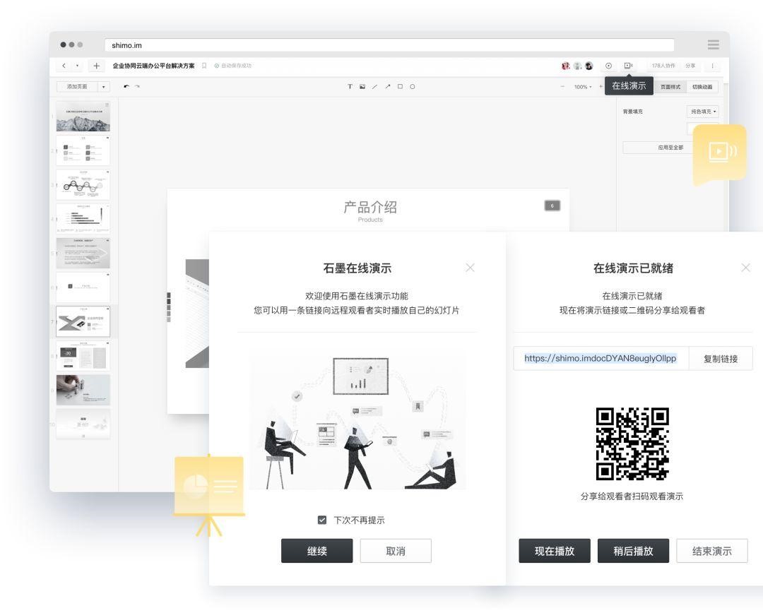 石墨還提供支持多人協(xié)作的幻燈片,團(tuán)隊(duì)成員可通過(guò)二維碼、鏈接分享給觀眾,無(wú)論身在何方,演示時(shí)觀眾只需打開(kāi)電腦、手機(jī)、Pad 等設(shè)備就能實(shí)時(shí)同步播放,即使遠(yuǎn)隔萬(wàn)里也如同在一個(gè)會(huì)議室面對(duì)面交流。
