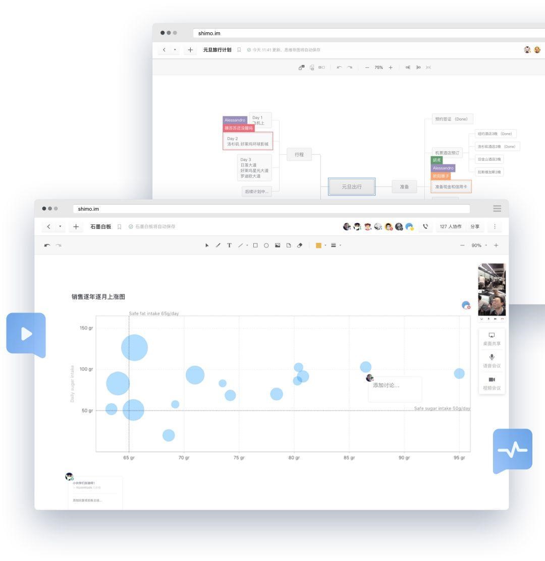 石墨白板讓遠(yuǎn)程會(huì)議更加高效便捷,多位成員通過(guò)音視頻連線,圍繞一個(gè)話題各抒己見(jiàn),邊聊邊寫(xiě),邊聊邊畫(huà),討論思路與結(jié)果同步呈現(xiàn)。