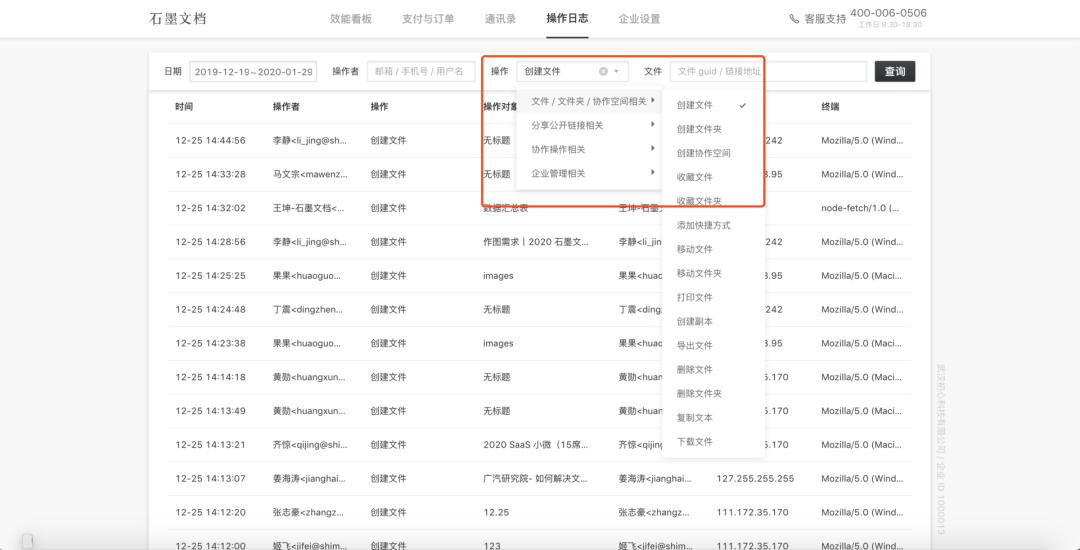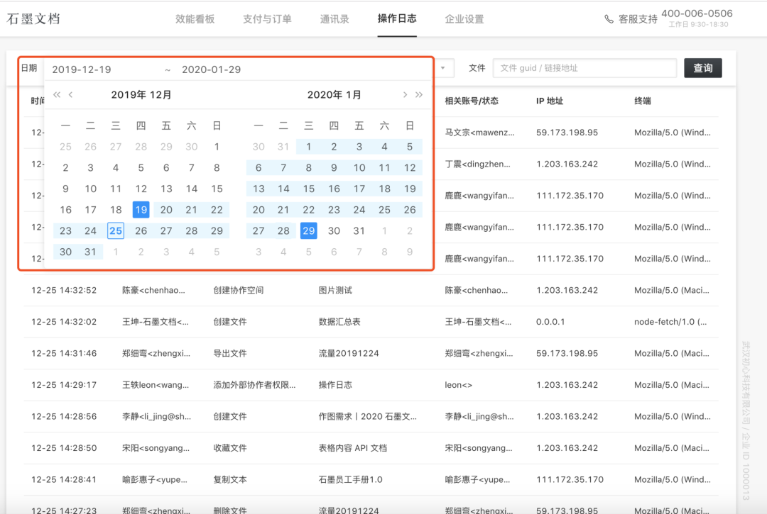 企業(yè)創(chuàng)建者和管理員在后臺(tái)可以查詢某一時(shí)間段的所有操作日志。
