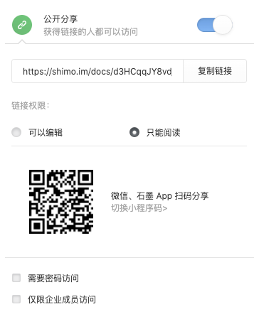 設(shè)置文檔公開(kāi)分享時(shí),可在石墨中設(shè)置“需要密碼訪問(wèn)”或“僅限企業(yè)成員訪問(wèn)”,從而實(shí)現(xiàn)文檔的定點(diǎn)定向傳輸,并可有效杜絕內(nèi)部文檔外泄。