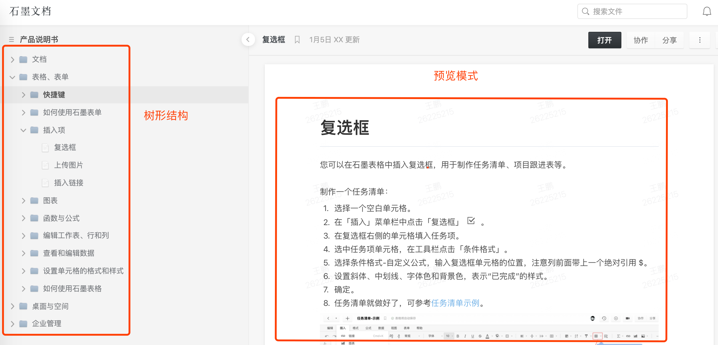 石墨的樹(shù)形結(jié)構(gòu)還提供預(yù)覽模式,用戶可直接在左側(cè)的空間目錄點(diǎn)擊文件夾或文件,右側(cè)實(shí)時(shí)預(yù)覽,查看文件內(nèi)容。