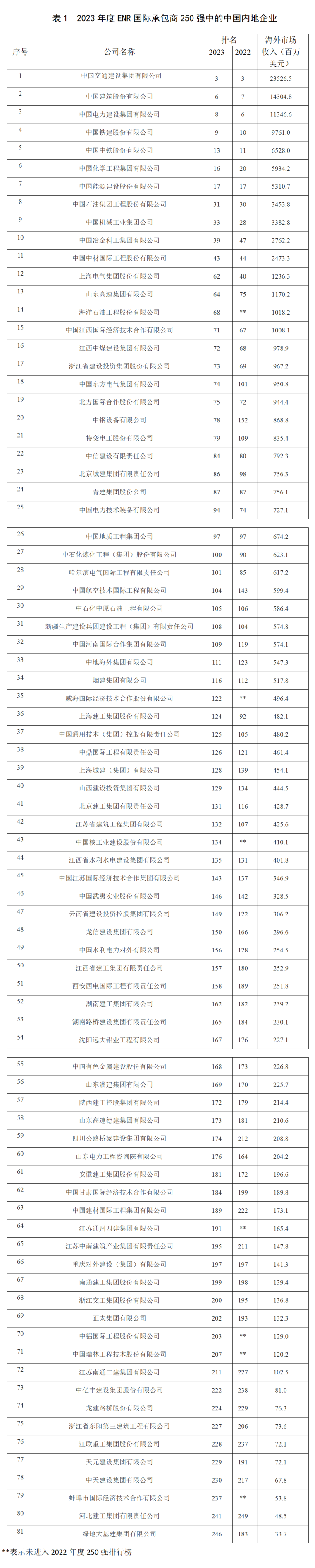 美國《工程新聞記錄》(簡稱“ENR”)雜志公布的2023年度全球最大250家國際承包商共實現海外市場營業收入4285.0億美元,較上年度增長7.7%,是近 10 年來罕見的增長速度。我國內地共有81家企業入選2023年度國際承包商250強榜單,入選數量比上一年度增加了2家。入選企業共實現海外市場營業收入1179.3億美元,收入合計占國際承包商250強海外市場營收總額的27.5%。