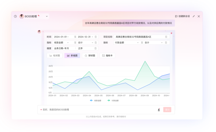 在具體應(yīng)用中,BOSS助理可快速鎖定數(shù)據(jù),例如查詢“張偉昨天提交的審批”,AI通過意圖識(shí)別下發(fā)指令,系統(tǒng)在判斷權(quán)限后返回列表,精準(zhǔn)調(diào)取對(duì)應(yīng)審批,實(shí)現(xiàn)急事優(yōu)先快速處理。此外,它還能響應(yīng)諸如“查看高碑店項(xiàng)目各供應(yīng)商支付情況”的復(fù)雜查詢,直接呈現(xiàn)合同金額、結(jié)算金額、支付金額等關(guān)鍵指標(biāo),幫助管理者快速發(fā)現(xiàn)異常并追溯源頭。