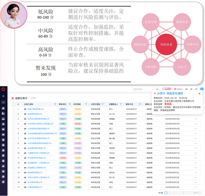 采購(gòu)助理還支持定期智能排查,自動(dòng)刷新已合作供應(yīng)商風(fēng)險(xiǎn)等級(jí),針對(duì)高風(fēng)險(xiǎn)供應(yīng)商及時(shí)預(yù)警,并可設(shè)置限制合作標(biāo)準(zhǔn),快速終止合作并系統(tǒng)溯源追查。通過構(gòu)建涵蓋組織架構(gòu)、企業(yè)年報(bào)、納稅評(píng)級(jí)、法律訴訟、天眼風(fēng)險(xiǎn)、失信人等維度的風(fēng)險(xiǎn)矩陣,采購(gòu)助理為企業(yè)建立起科學(xué)、透明、高效的供應(yīng)商管理體系。