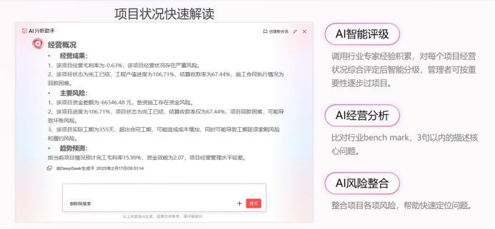紅圈AI系列智能產(chǎn)品中的項目360°AI解讀,通過整合全維經(jīng)營指標,一鍵生成項目全景作戰(zhàn)圖,讓復雜數(shù)據(jù)轉(zhuǎn)化為清晰決策語言。該功能能夠?qū)椖拷?jīng)營狀況進行智能評級,并整合各項風險,幫助管理者快速定位問題。通過結構化呈現(xiàn)項目關鍵信息、收支分析、資金分析和成本構成等數(shù)據(jù),項目360°AI解讀使項目進度監(jiān)控更加精準高效。這種透明化的進度跟蹤,不僅提高了項目執(zhí)行效率,也降低了因延期導致的額外成本。