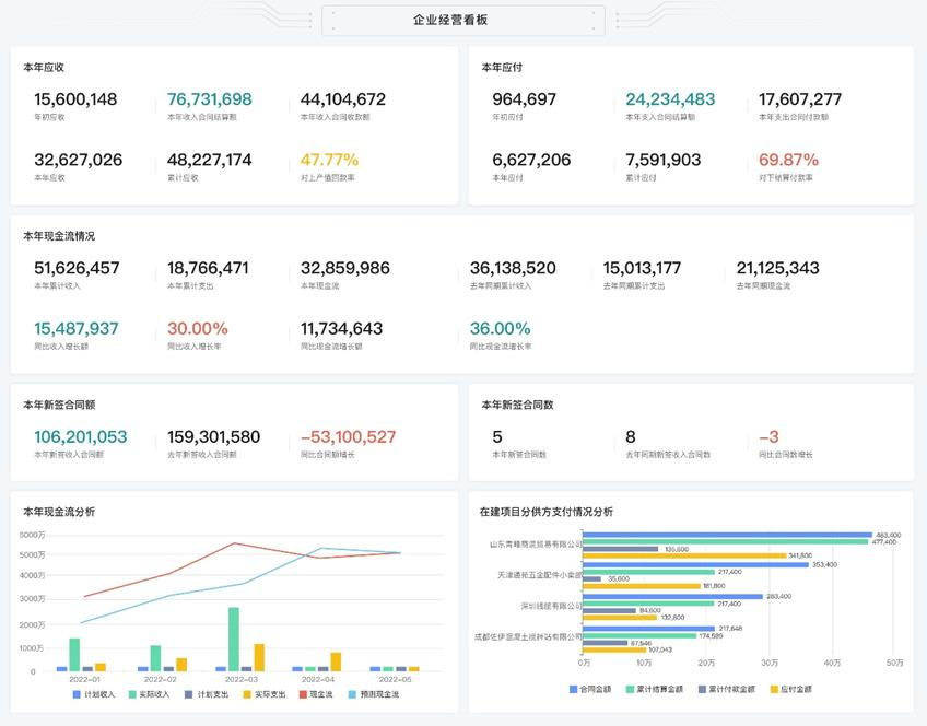 → 三級資金穿透看板:實時監控集團/子公司/單項目的資金結余、墊資情況及現金流健康度