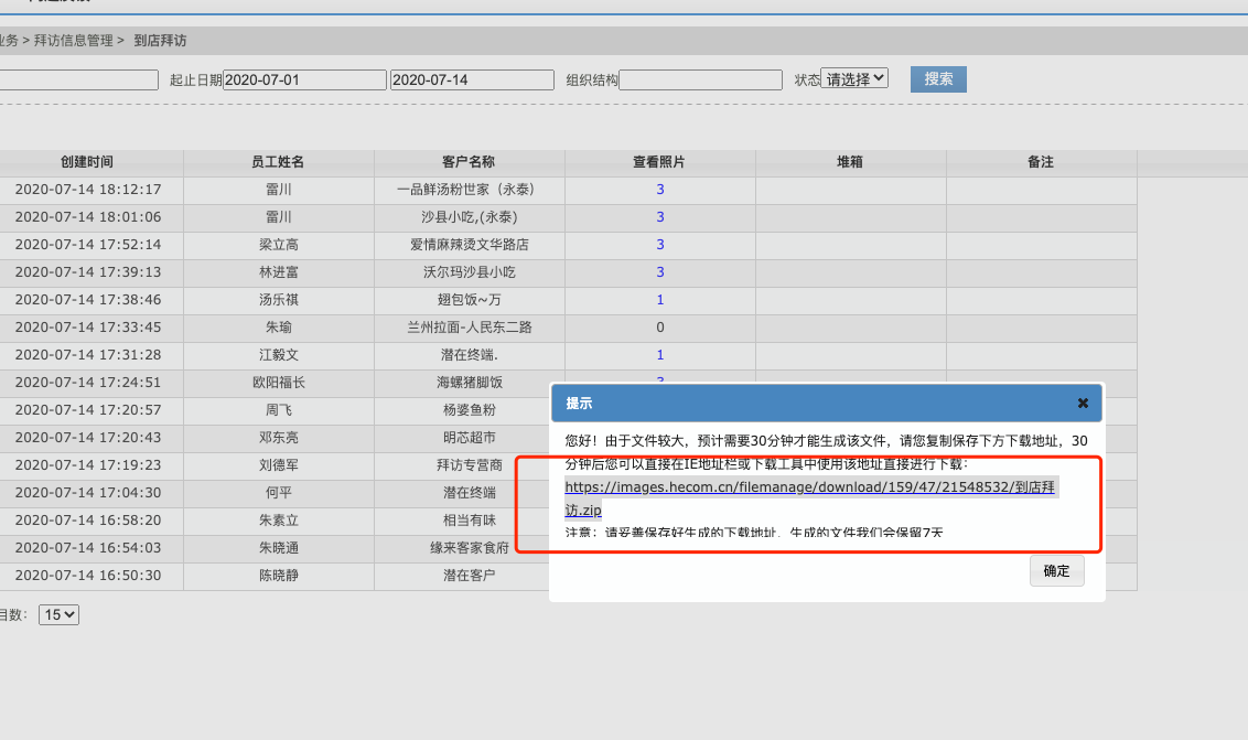 帶圖片數(shù)據(jù)可能會比較大,中等企業(yè)(500人以下)一個(gè)月驗(yàn)證生成壓縮包文件大小有幾百M(fèi)左右(主要是圖片太多占用空間),點(diǎn)擊導(dǎo)出以后記錄生成的下載鏈接一般15分鐘左右后可以開始下載,如果下載不成功說明文件還沒有生成完(數(shù)據(jù)庫查詢完數(shù)據(jù)再寫入Excel文件,包括寫入圖片,會比較耗時(shí))。